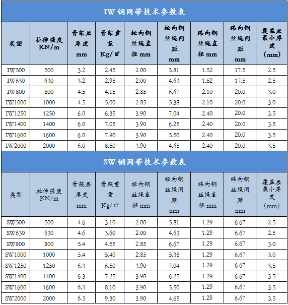 該輸送帶是由整體編織的鋼網(wǎng)為骨架層,具有非常好的抗撕裂性能,可有效地防止異物的穿刺,且具有優(yōu)異的耐熱性能。IW輸送帶適用于需要抗沖擊、抗撕裂特性的礦石裝卸、采石場、煤炭和礦石堆場;需要耐高溫灼燒特性的冶金燒結(jié)、焦炭廠;需要高曲饒?zhí)匦缘亩份啓C(jī)裝卸。SW輸送帶非常適用于垂直輸送物料,廣泛應(yīng)用于冶金、化工、水泥、電力、糧食等行業(yè)。